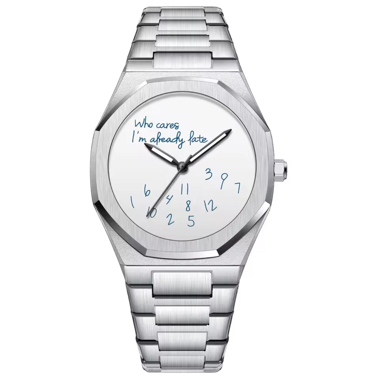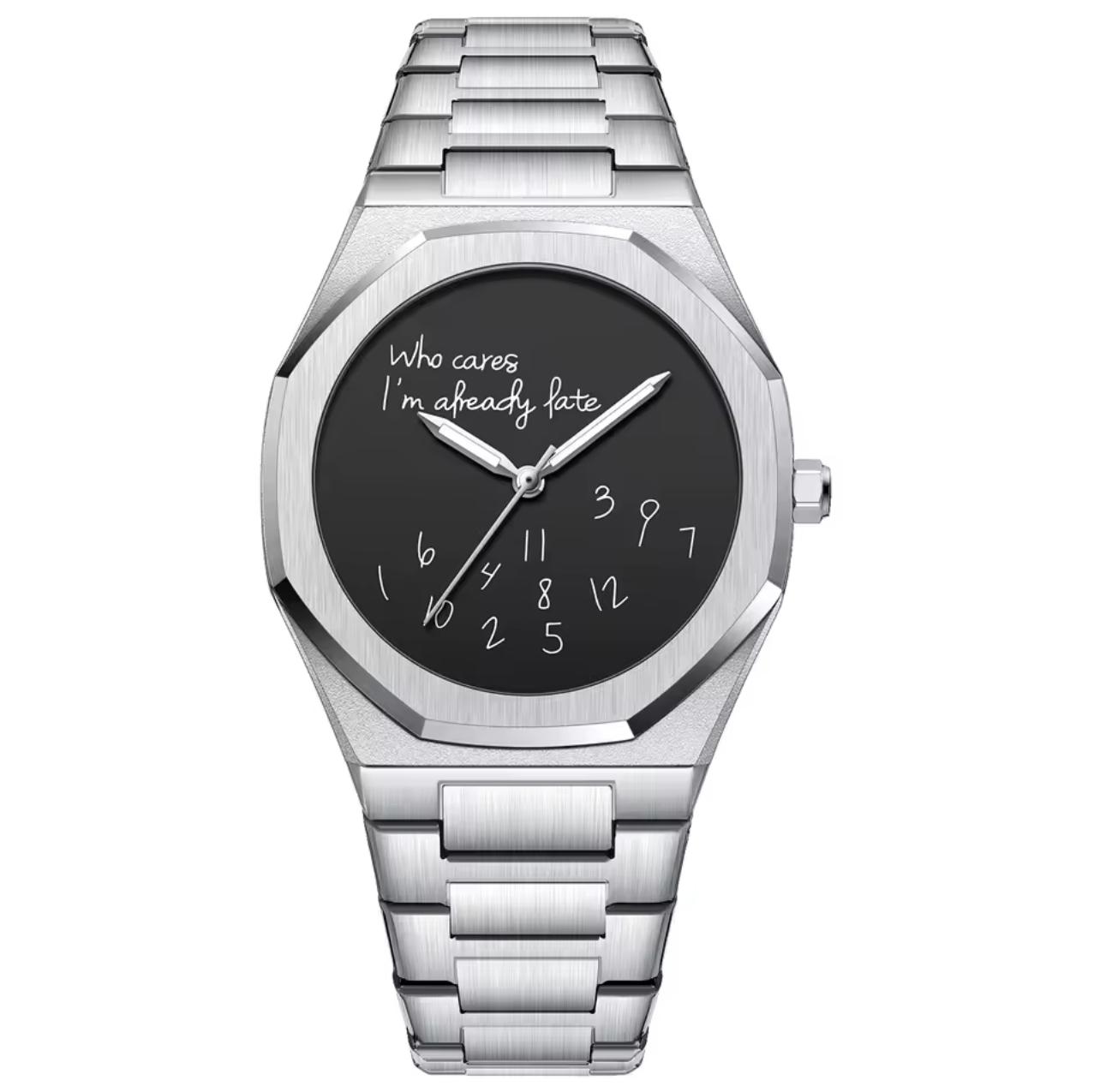 • Minimalistisches Zifferblatt mit “WHO CARES I’M ALREADY LATE”